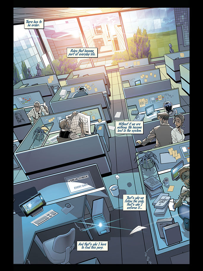 Overrun features the amazing art of Paul Green. Paul’s style captured the characters and locations of the universe, and he was a perfect match for the 'computer as a real world setting'. With 114 pages of story this good, we needed some top lettering to put the icing on the cake - step forward tag-team duo, Troy Peteri and Joshua Cozine, who brought a fresh look to our dialogue and some outstanding special effects to the production.